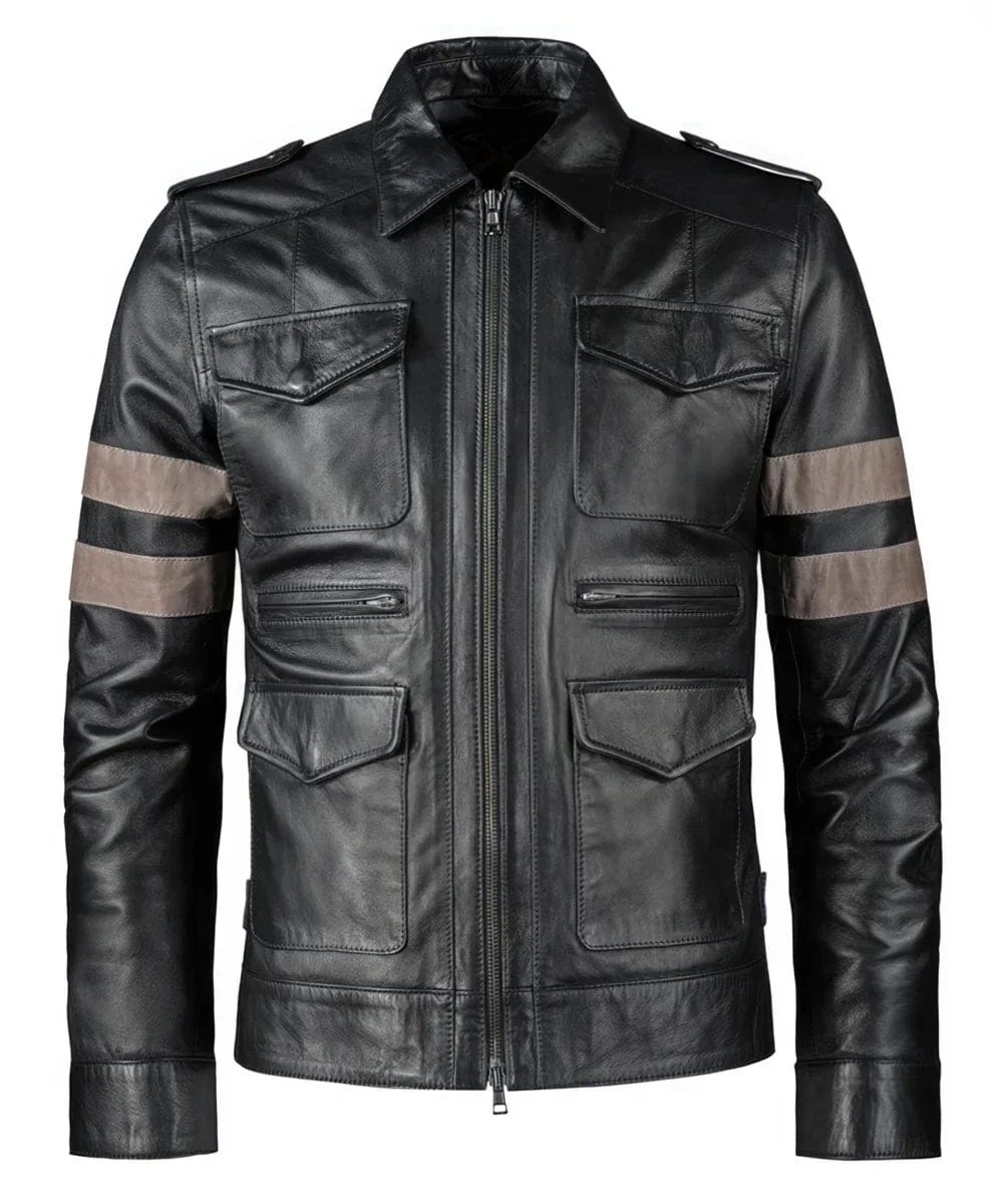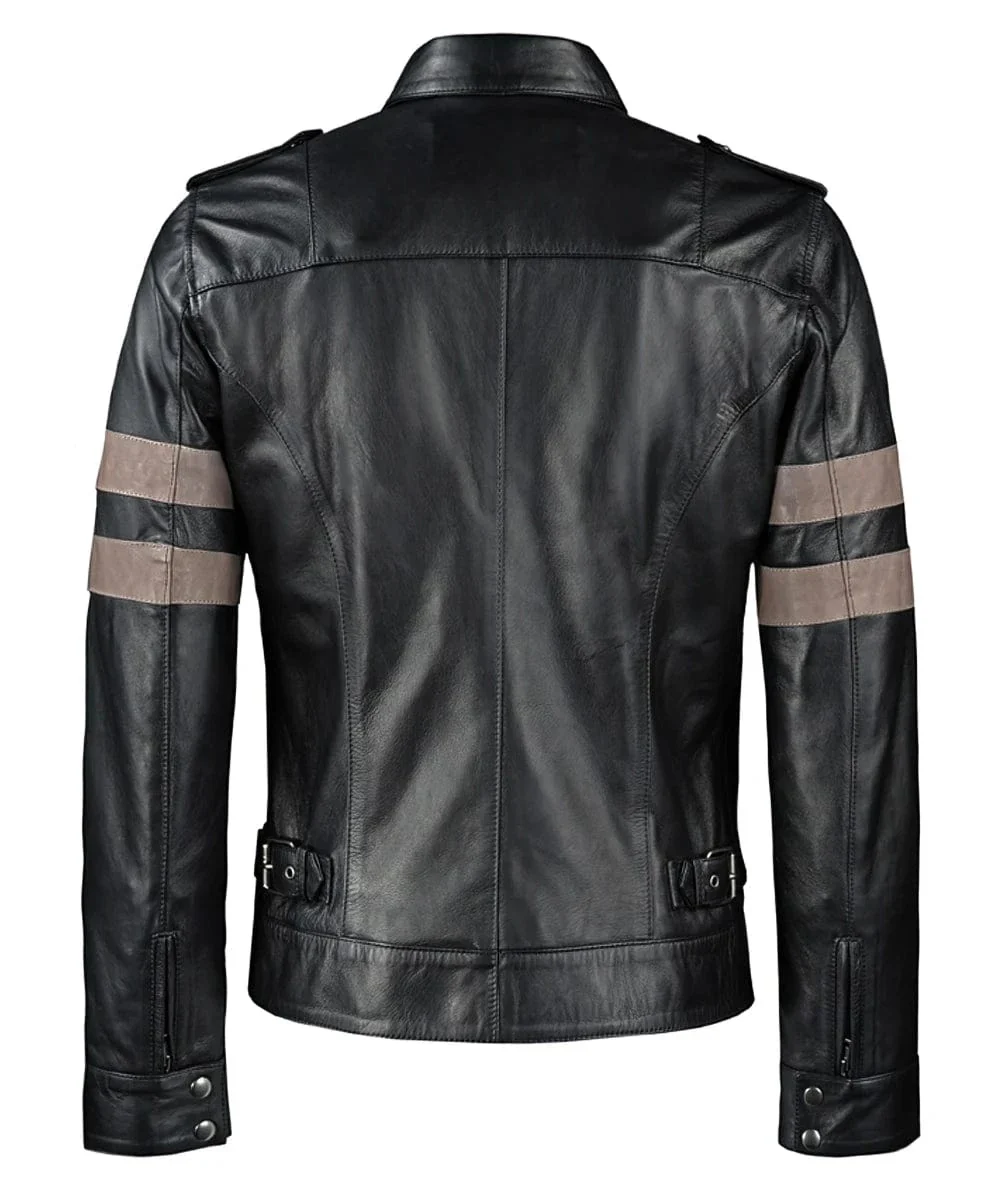 Black Leather Brown Stripes Jacket For Men