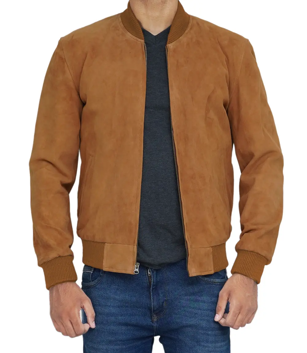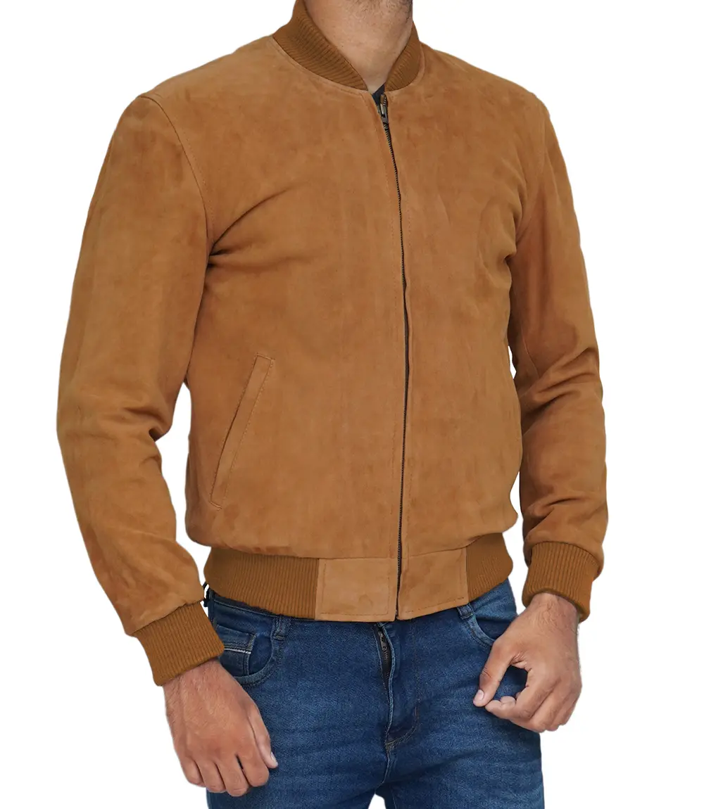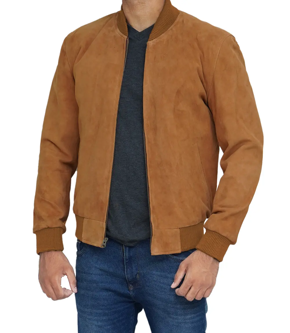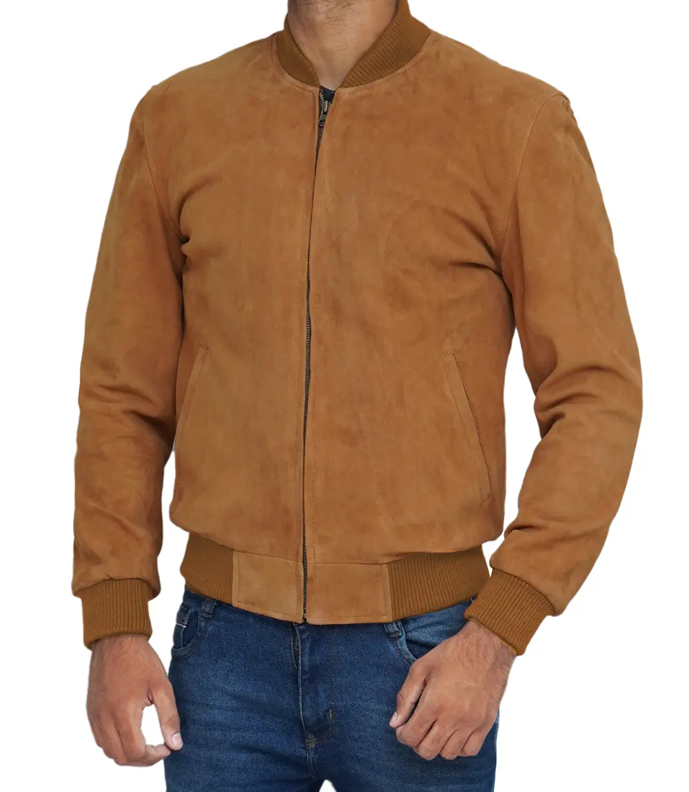 Men Light Brown Suede Bomber Jacket