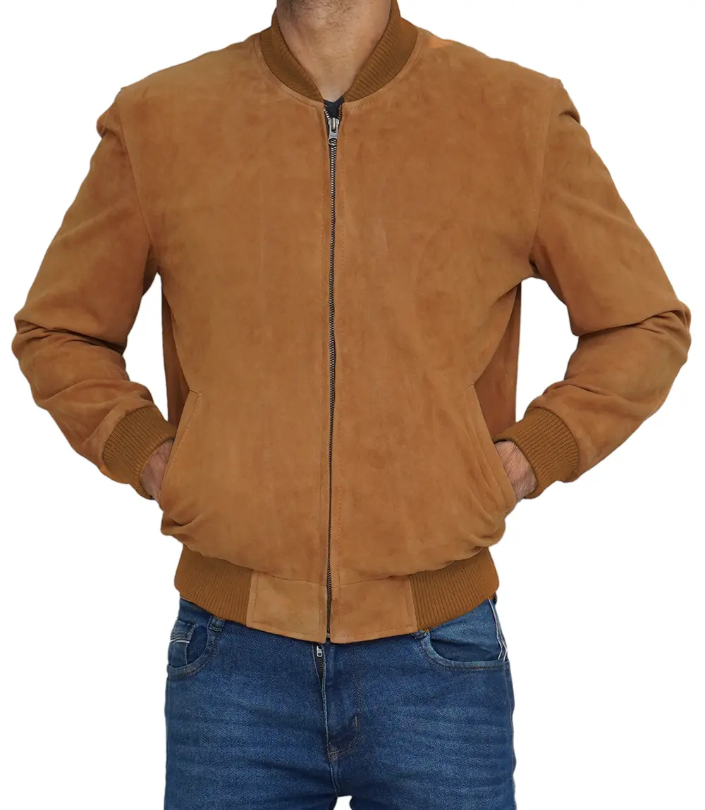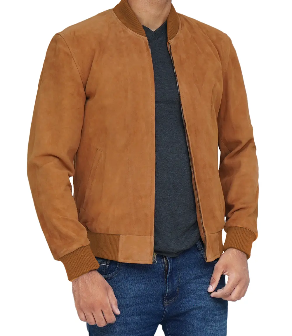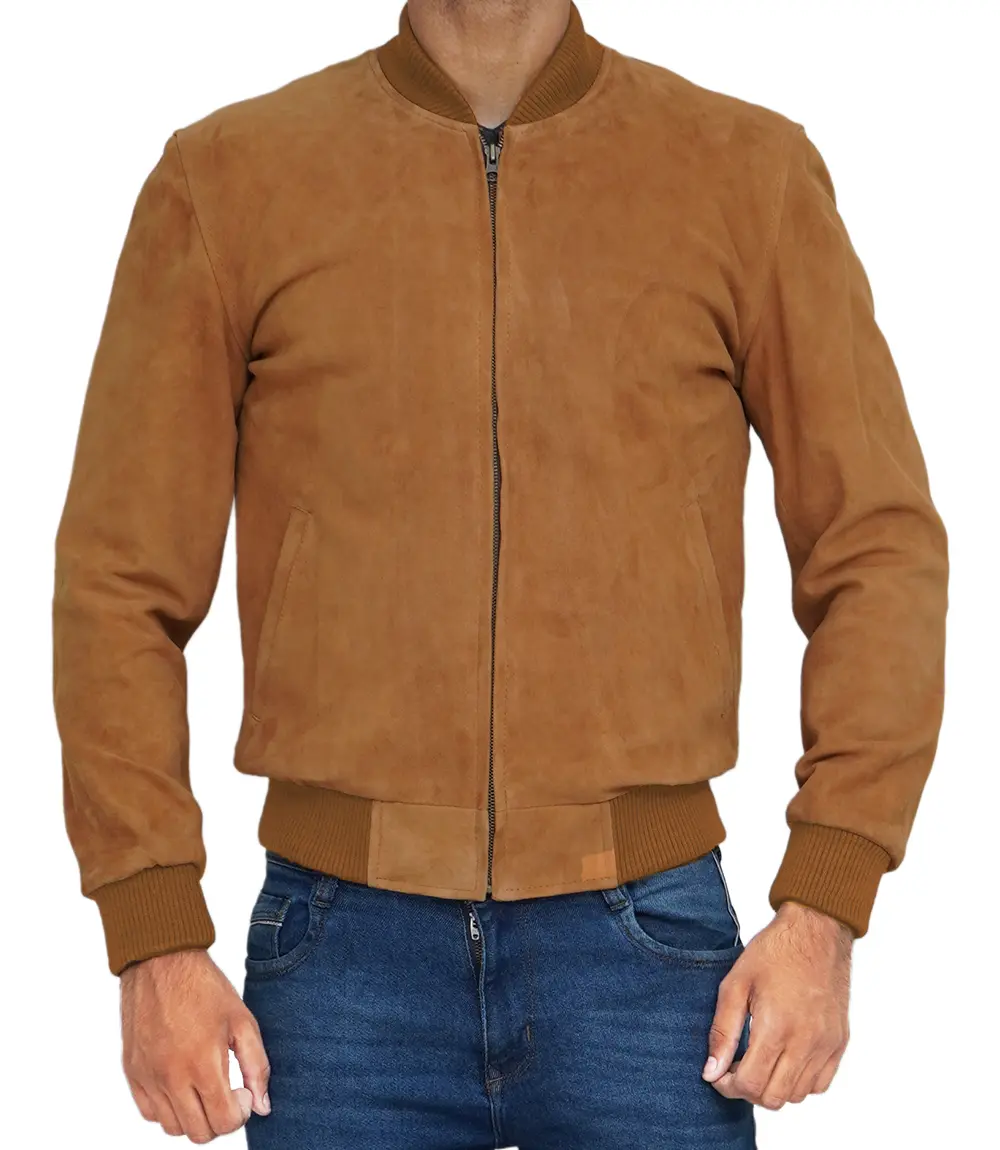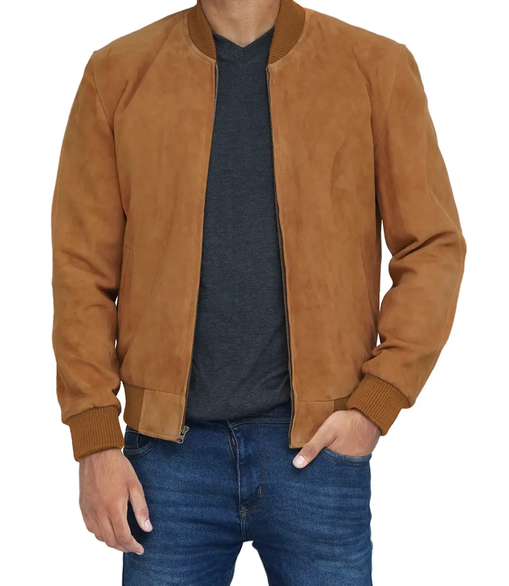 Men Light Brown Suede Bomber Jacket