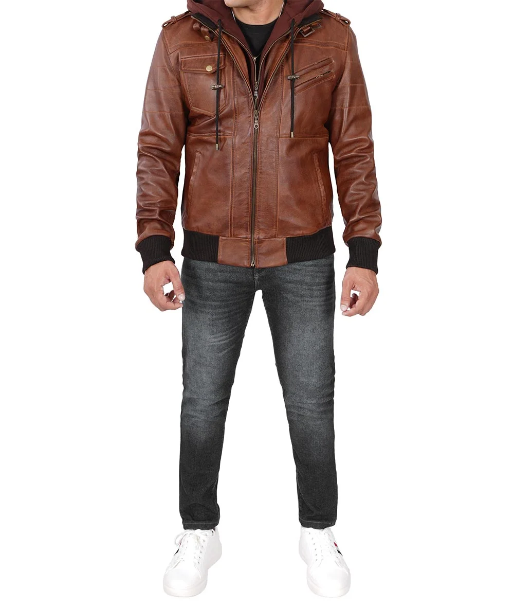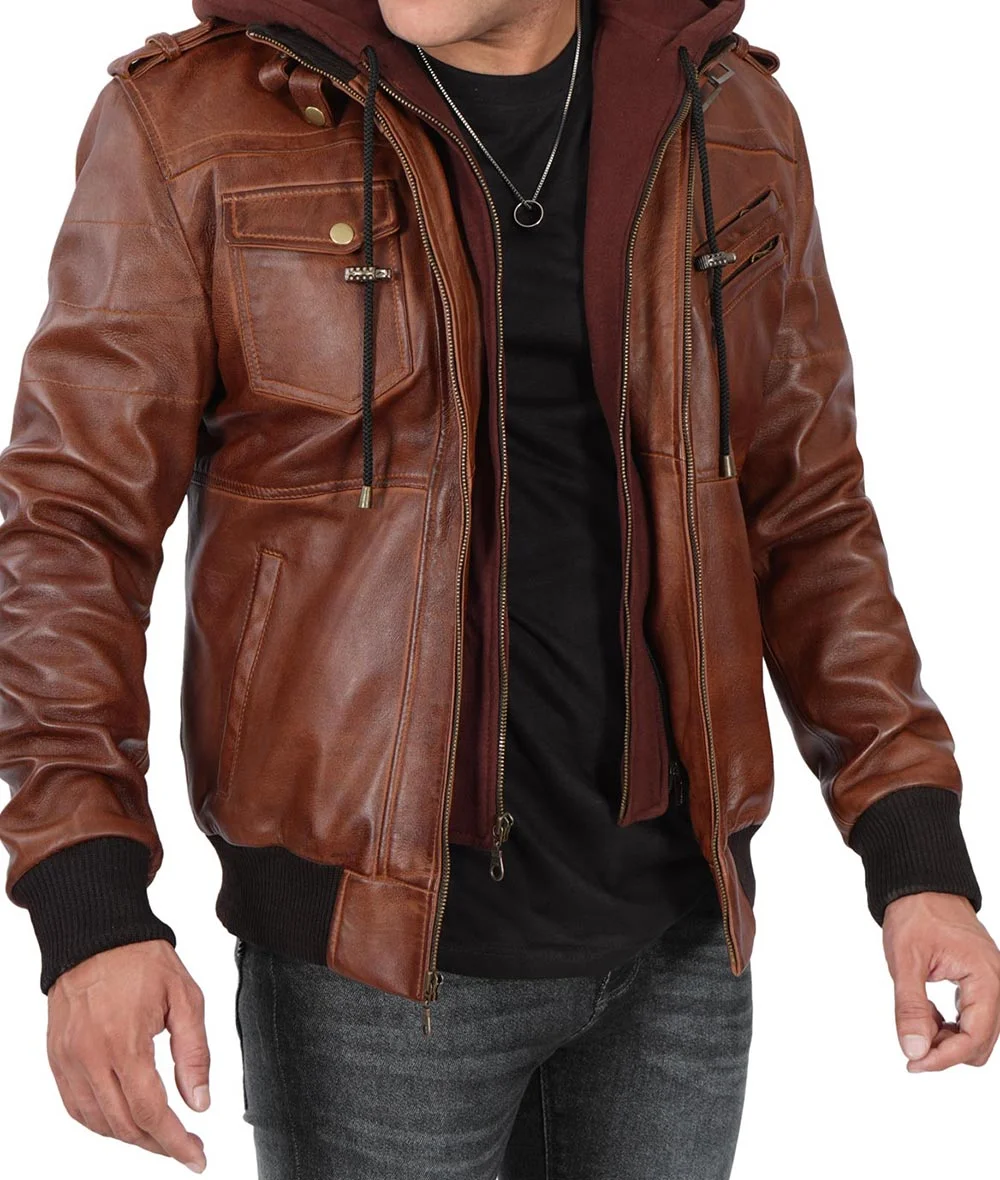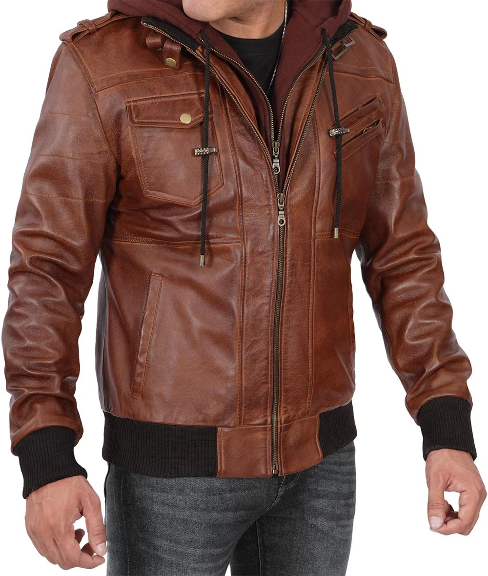 Mens Brown Tall Bomber Leather Jacket With Removable Hood