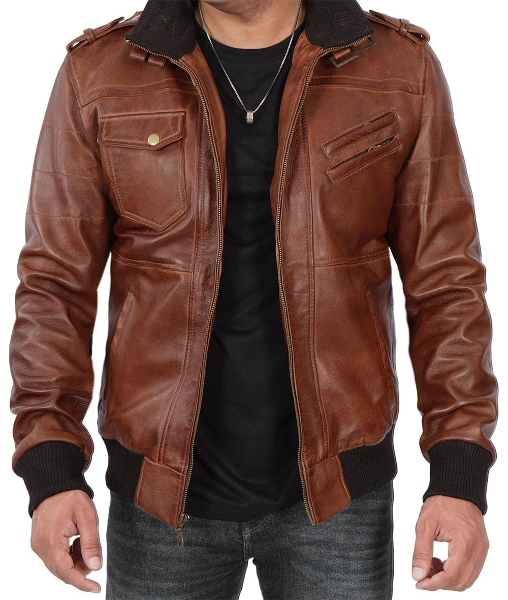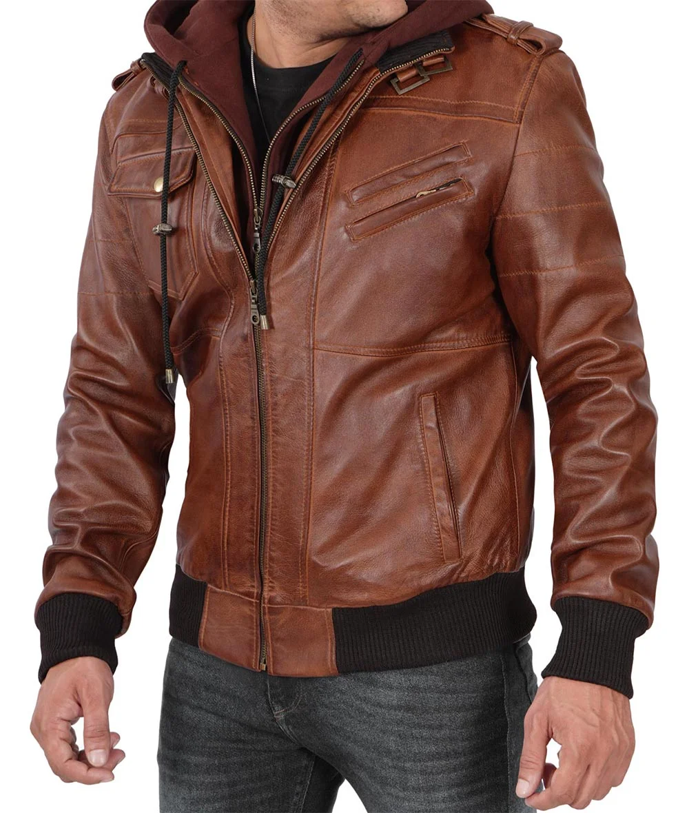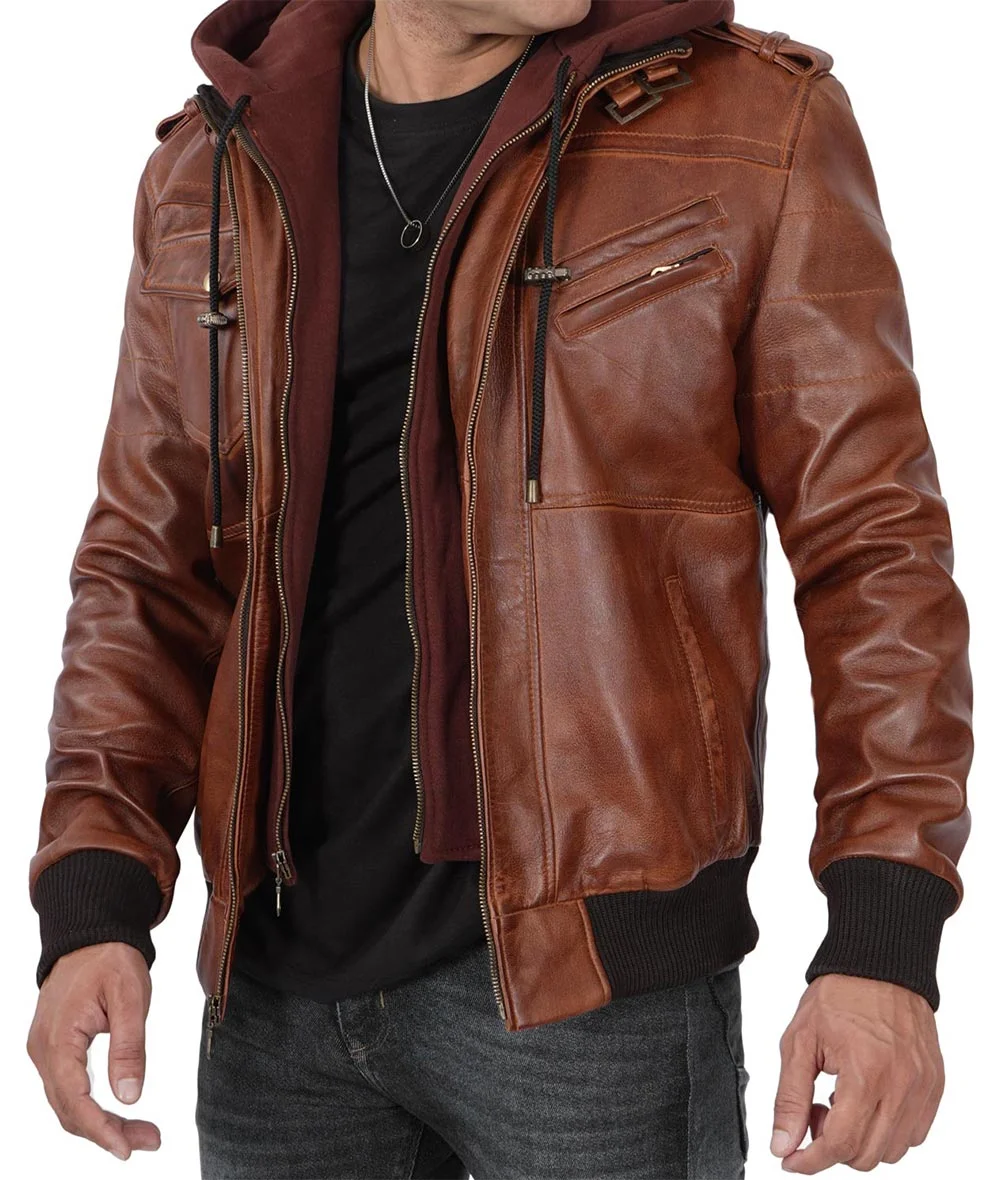 Mens Brown Tall Bomber Leather Jacket With Removable Hood