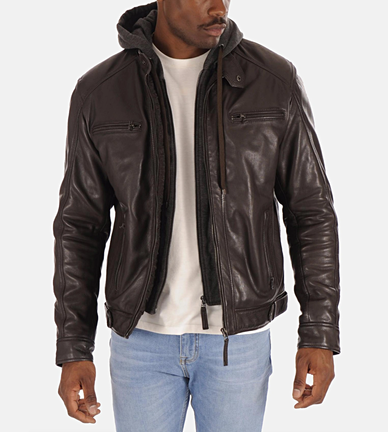 Mens Dark Brown Hood Lambskin Leather Jacket